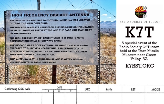 The Radio Society of Tucson will operate special event callsign K7T from the Titan Missile Museum on November 1, 2025 from about 1700z to 2100z (10am – 2pm AZ local time). We will operate CW and SSB on at least 20, 15, and 10 meter bands using the original Collins Radio Company broadband discone antenna.